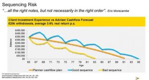When investing there are likely to be years when markets increase, and years when they decrease. The order and timing of good years and bad years can affect how much income you will have in retirement and how long your fund will last. The reason that the sequence matters is because in retirement you are taking an income from the fund. Taking an income in bad years crystallises losses.